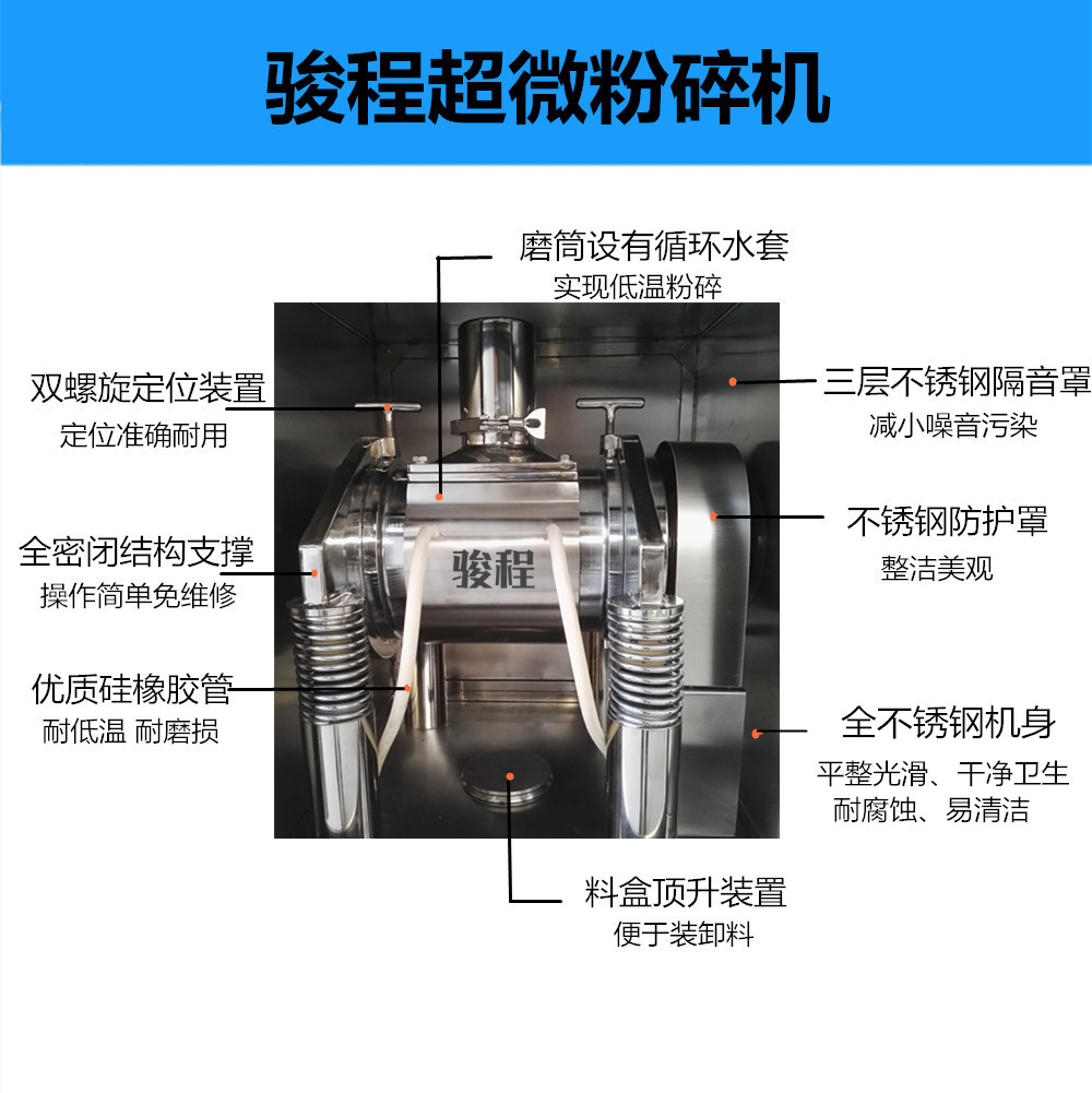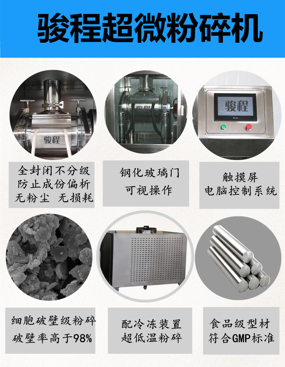 骏程超微粉碎机应用于中药制剂中使中药粉体粒度细微均匀,比表面积增加,孔隙率增加,细胞破壁率提高,有效成分能较好地分散、溶散在提取液或胃肠液中,提高药物的生物利用度或有效成分的提取率。