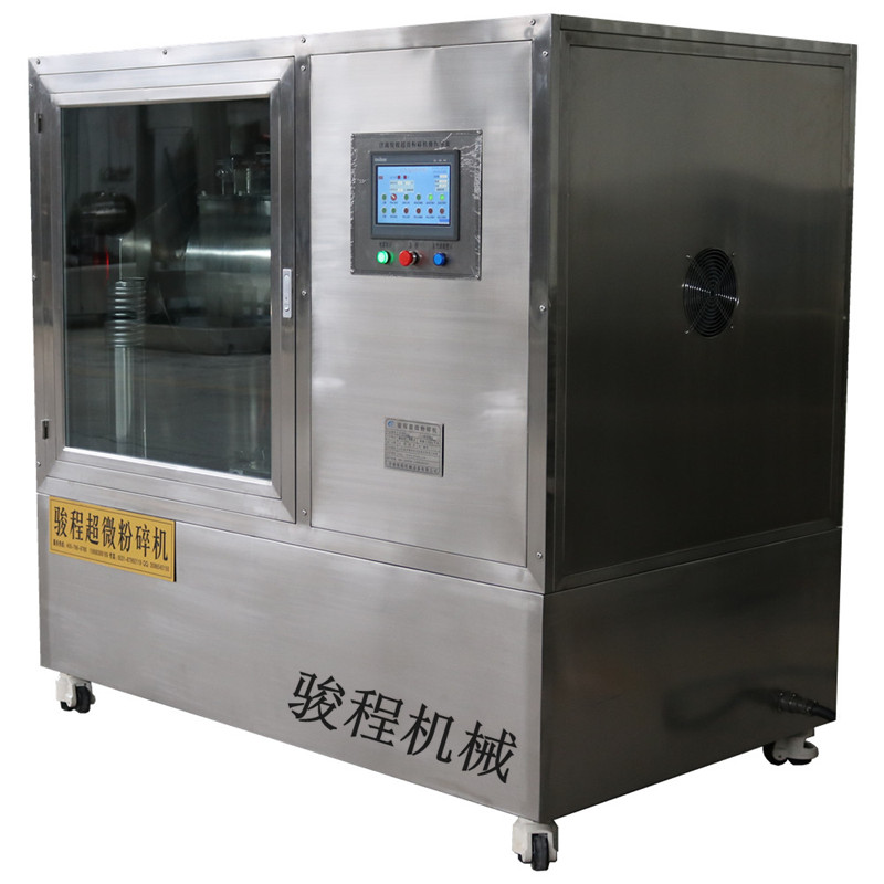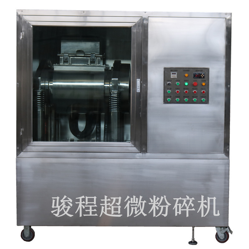 JCWF-50ZD天麻超微粉碎机又称低温超微粉碎机,还称细胞破壁机、振动式研磨机,属于振动磨。利用高强度的振动和剪切力,使物料在磨筒内受到高速度的撞击、切磋,物料在高加速度冲击力和剪切力双向复合力的作用下压缩撕裂破碎,达到超微粉的效果。该设备由于磨筒内外和两侧都设有循环水套,制冷效果佳,低温粉碎效果好。该机装料量为15L/次,对于普通中药材建议装料量12L/次,对于叶类比重较轻的物料装料量15L/次,具体装料量要依据物料的特性而定。该设备的操作过程比较简单,将待粉碎物料装入料盒,将料盒料盒与磨筒进料口对接,接合面接触良好且缝隙均匀后,装上手柄,锁紧凸轮向下旋转约120°,使料盒与进料筒可靠锁紧,取下手柄。转换“手动/自动转换”开关至自动位置,先按下“系统启动”按钮,料盒自动翻转至磨筒上方,并自动将磨筒定位锁紧,磨机便可进行粉碎工作。到设定时间自动停止振动,料盒自动向下翻转至磨筒下方,磨机自动振动卸料30s(时间可以根据实际情况设定),使研磨好的成品进入料盒,磨机自动停止,脚踏气动抬升按钮,抬升托盘将料盒抬起,将小车推至内端,装上手柄,旋转锁紧凸轮至原位,使料盒与进料筒分开,脚踏气动下降按钮,料盒落下,再将料盒小车退回至外端(门口),即完成一个粉碎周期。