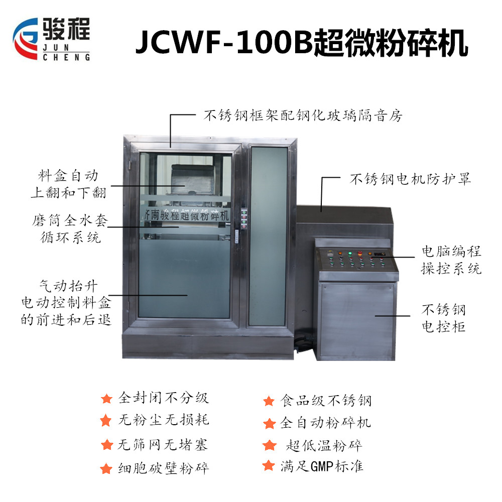 今天我们主要介绍骏程100型座式超微粉碎机,该粉碎机属振动式生产型超微粉碎机, 自动翻转,自动锁紧,自动排料,智能化操作,操作简便。占地面积小,易拆卸、易组装、易清洗、易换料。